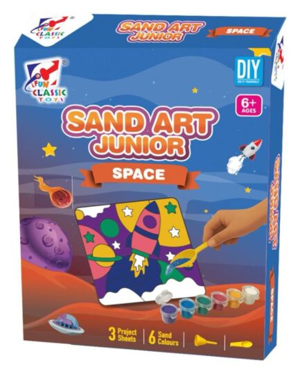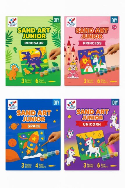 Unleash your child’s creativity with Fun Classic Toys Sand Art Junior DIY Craft Kit! This comprehensive set features four enchanting themes – Princess, Dinosaur, Space, and Unicorn – perfect for young artists aged 6 and above. Each themed set includes 3 project sheets and 6 vibrant sand colours to create stunning artwork. Children can bring magical castles, prehistoric creatures, cosmic adventures, and mystical unicorns to life using the simple yet engaging sand art technique. The kit comes with all necessary tools and easy-to-follow instructions, making it an ideal activity for developing fine motor skills and artistic expression. Watch as your little ones carefully fill in the adhesive patterns with colourful sand, creating dimensional masterpieces they’ll be proud to display. This DIY craft kit offers hours of screen-free entertainment while fostering creativity and concentration. The perfect blend of art and play makes this an excellent gift choice for budding artists and craft enthusiasts.